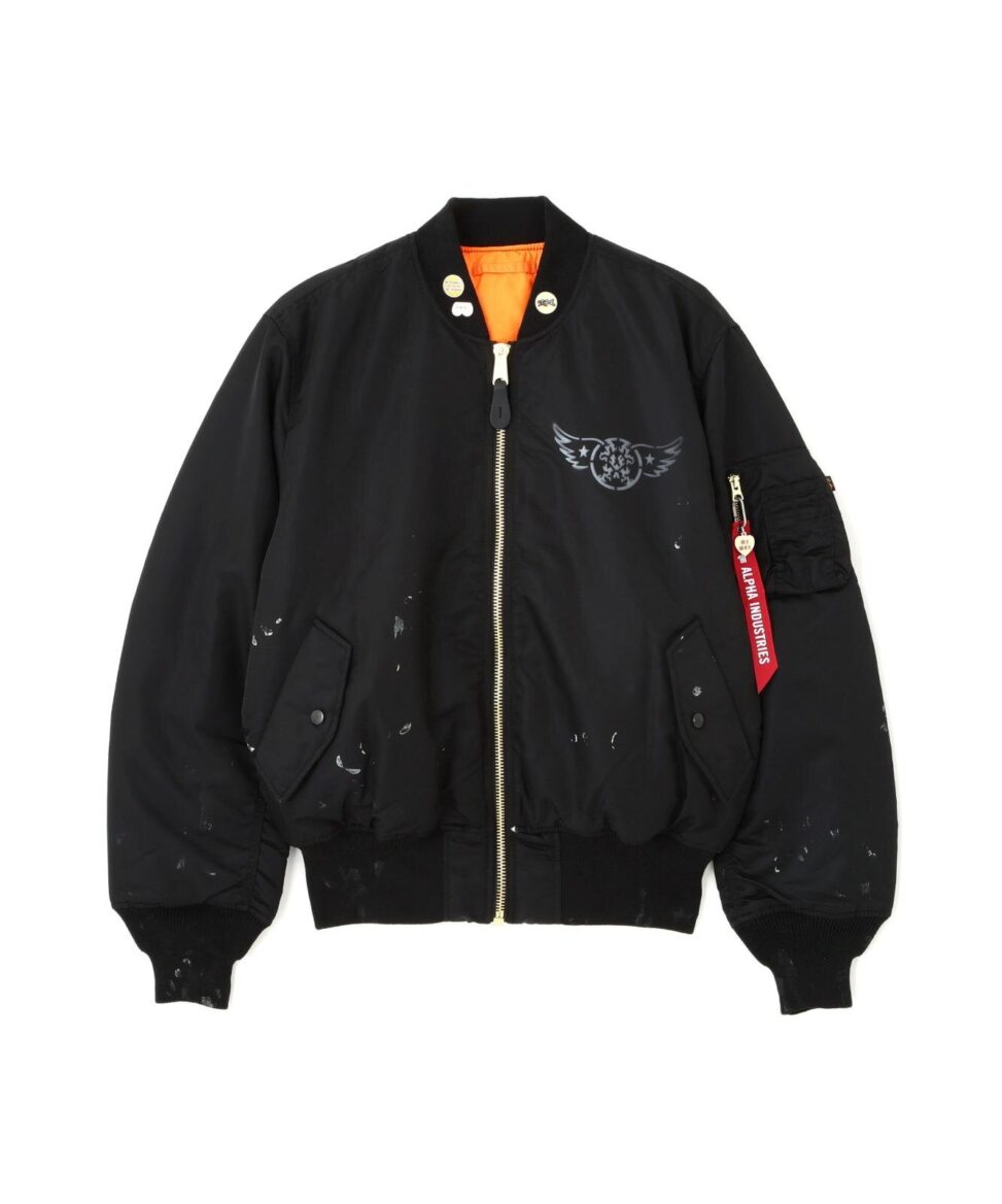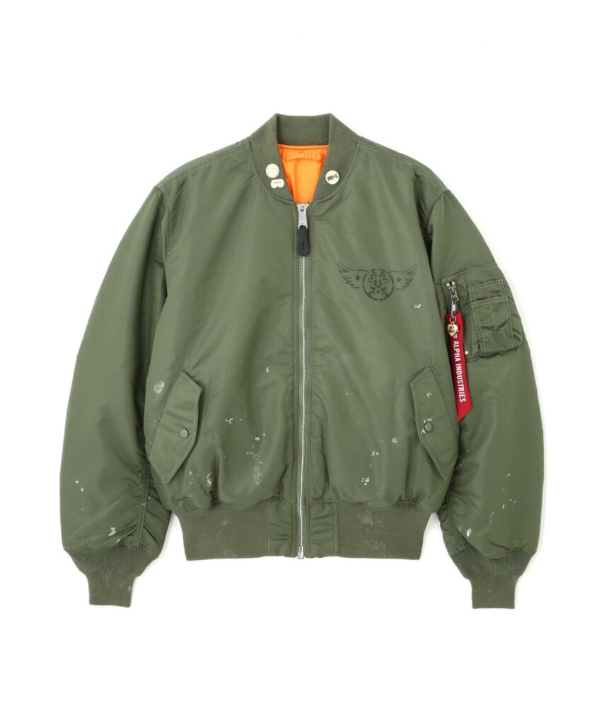 今回のコラボレーションMA-1は、アルファ インダストリーズの定番フライトジャケットをベースに、カミヤならではのリメイク感覚を落とし込んだ一着。古いステンシル機を用いて型紙からロゴを転写する加工を施しており、使い込まれたような独特の風合いを表現している。さらに、ホワイトベージュの染料が飛び散ったようなデザインを加えることで、ヴィンテージ感とアート性を融合させた。