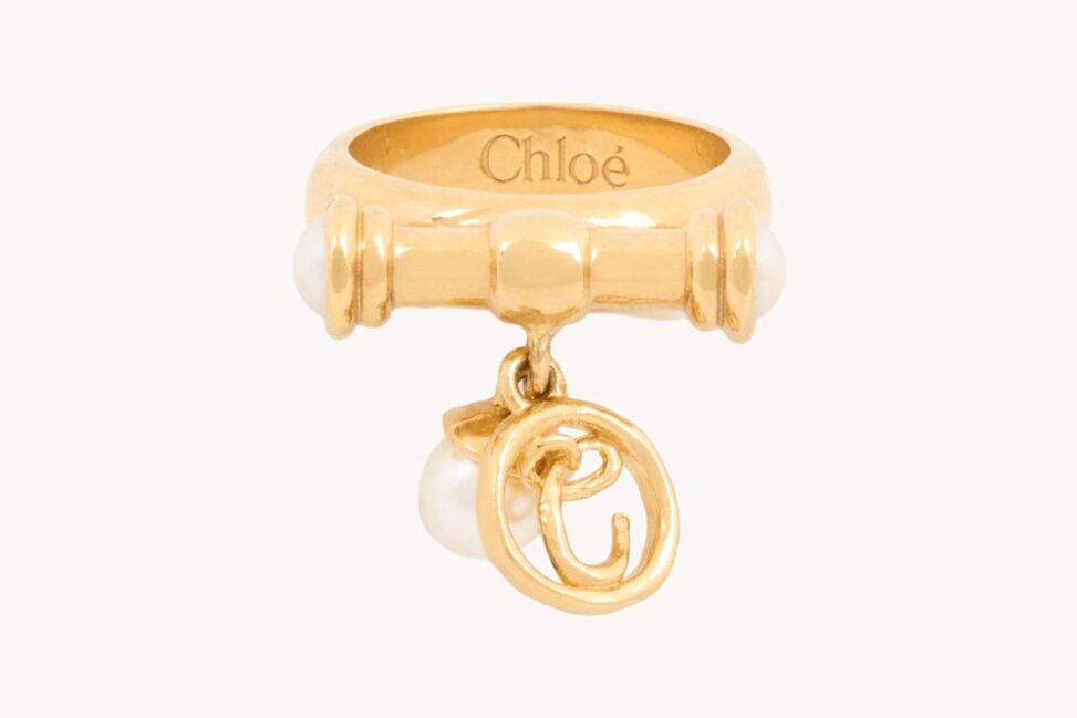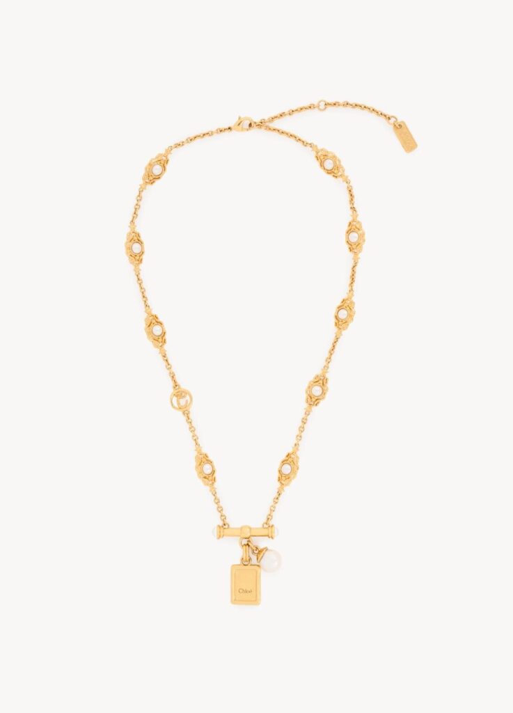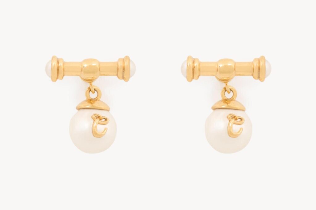ネックレスは、ゴールドブラス製のTバーに連なるように、クロエロゴ入りプレートとレジンパールを配置。チェーン部分にも小さなパール装飾を散りばめ、動くたびに上品な輝きを放つ。まるでヴィンテージジュエリーのような存在感を放ちながらも、軽やかで現代的な仕上がりとなっている。