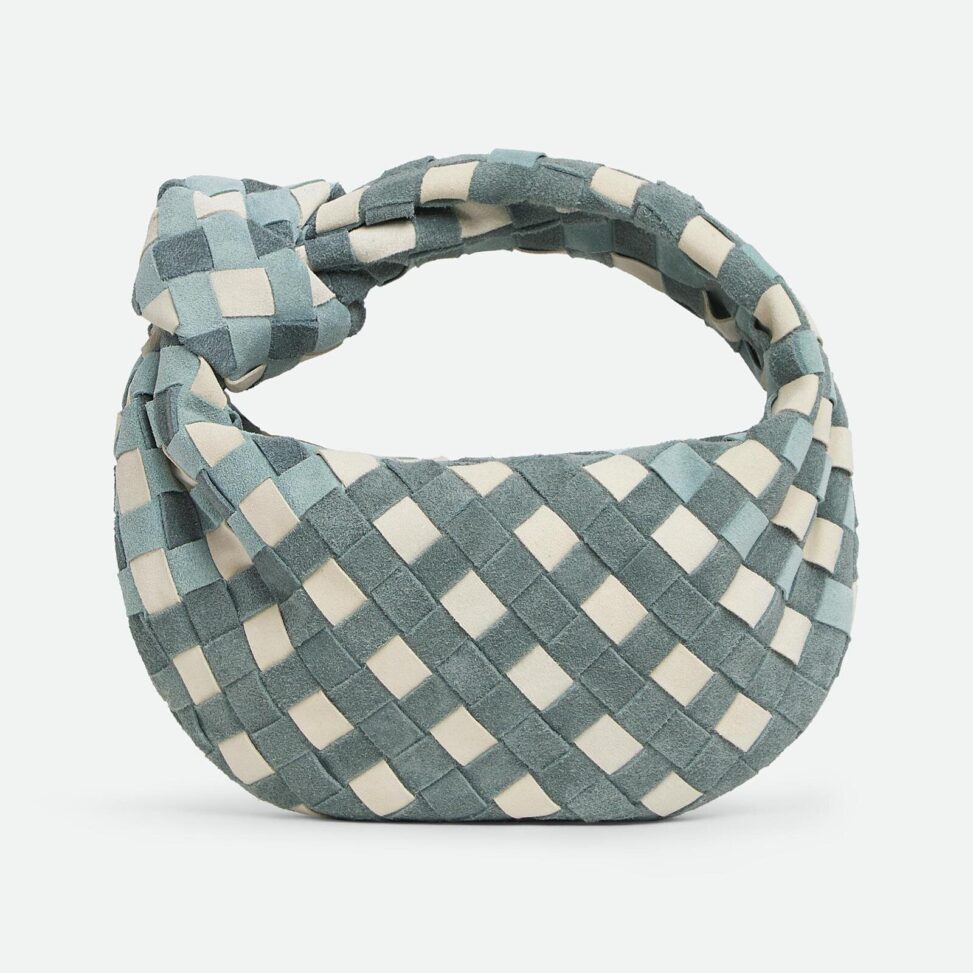 一方、スエードレザーを再利用したモデルは、しっとりとした質感とやわらかな色合いが魅力。優しいトーンで構成されたホーボーシルエットの「ミニ ジョディ」は、ボッテガ・ヴェネタの象徴でもあるノット(結び目)ディテールを配し、ライトブルーのアクセントを効かせてモダンな印象に。ラフさの中にも洗練を感じさせるバランスの取れたデザインだ。