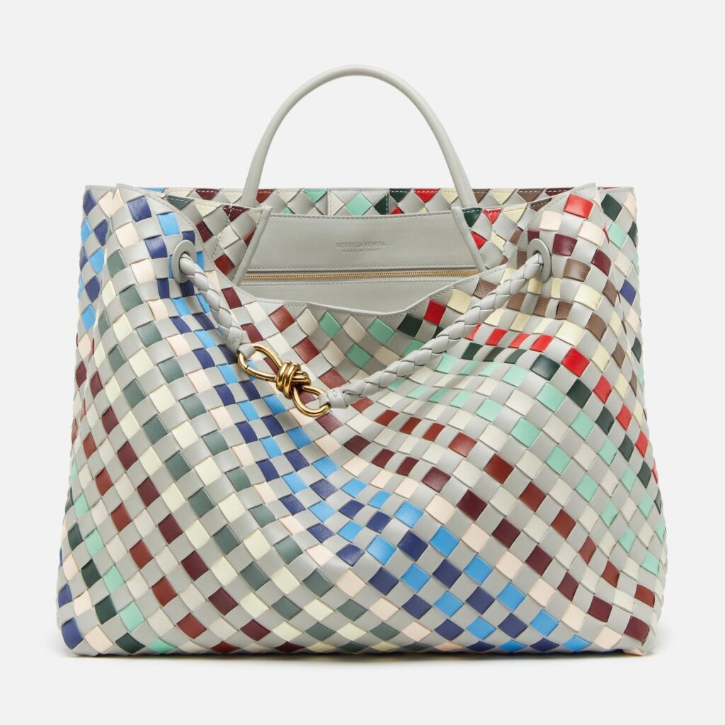 今回のコレクションを代表するのが、ナッパレザーで仕立てたハンドバッグ「ラージ アンディアーモ」。グレーを基調としたボディに、15色ものレザーを組み合わせ、ストライプ状に編み上げた大胆なデザインが印象的だ。暖色と寒色をリズミカルに並べることで、視覚的なコントラストと遊び心を生み出し、まるでアートピースのような存在感を放つ。職人による丁寧な手仕事によって、レザーの光沢や質感の違いが美しく際立っている。