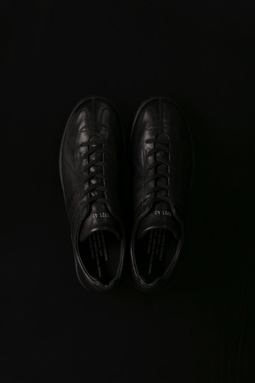 アッパーには、従来のカウレザーよりも光沢と耐久性に優れたイタリア製ホースハイド(馬革)を使用。通常は内側となる銀面を外側に、裏面を内側に配することで、マットと艶のコントラストを生み出している。縫い目をあえて外に出した構造は、手仕事の跡を感じさせる無骨な美しさを演出。さらに、サイドのロゴを鏡文字で配置することで、デザイン全体に“インサイドアウト”というコンセプトを貫いている。