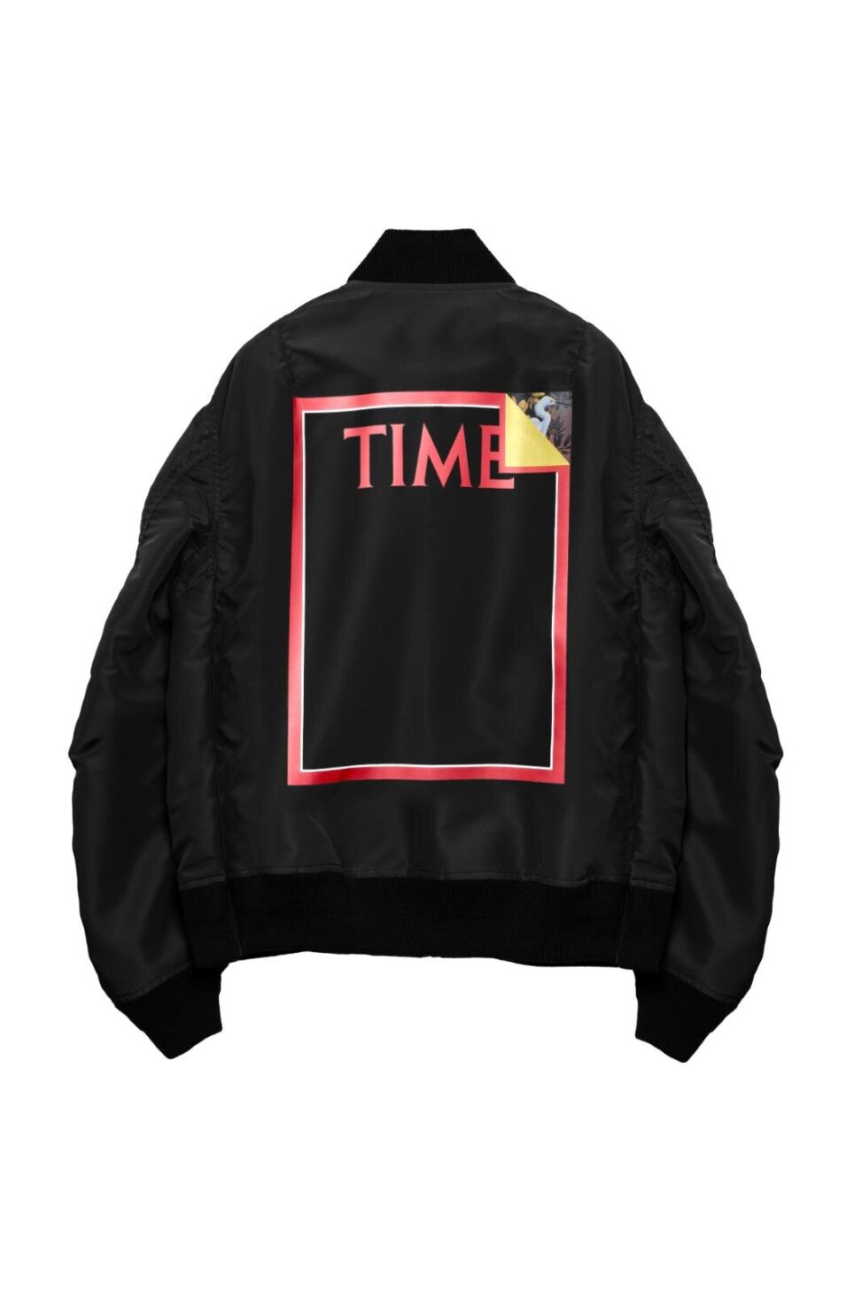 マンゴ・トムソンはロサンゼルスを拠点に活動し、映像・音・彫刻・インスタレーションなど幅広いメディアを通して「時間」「空間」「知覚」への問いを提示するアーティスト。日常の見慣れた要素に新しい視点を与えるコンセプチュアルな作風で知られている。今回のコラボレーションでは、彼の代表作のひとつ「TIMEミラー(TIME Mirror)」シリーズをフィーチャー。雑誌『TIME』の表紙を思わせる赤いフレームとロゴをモチーフにした大胆なグラフィックを、sacaiのウェアに落とし込んだ。