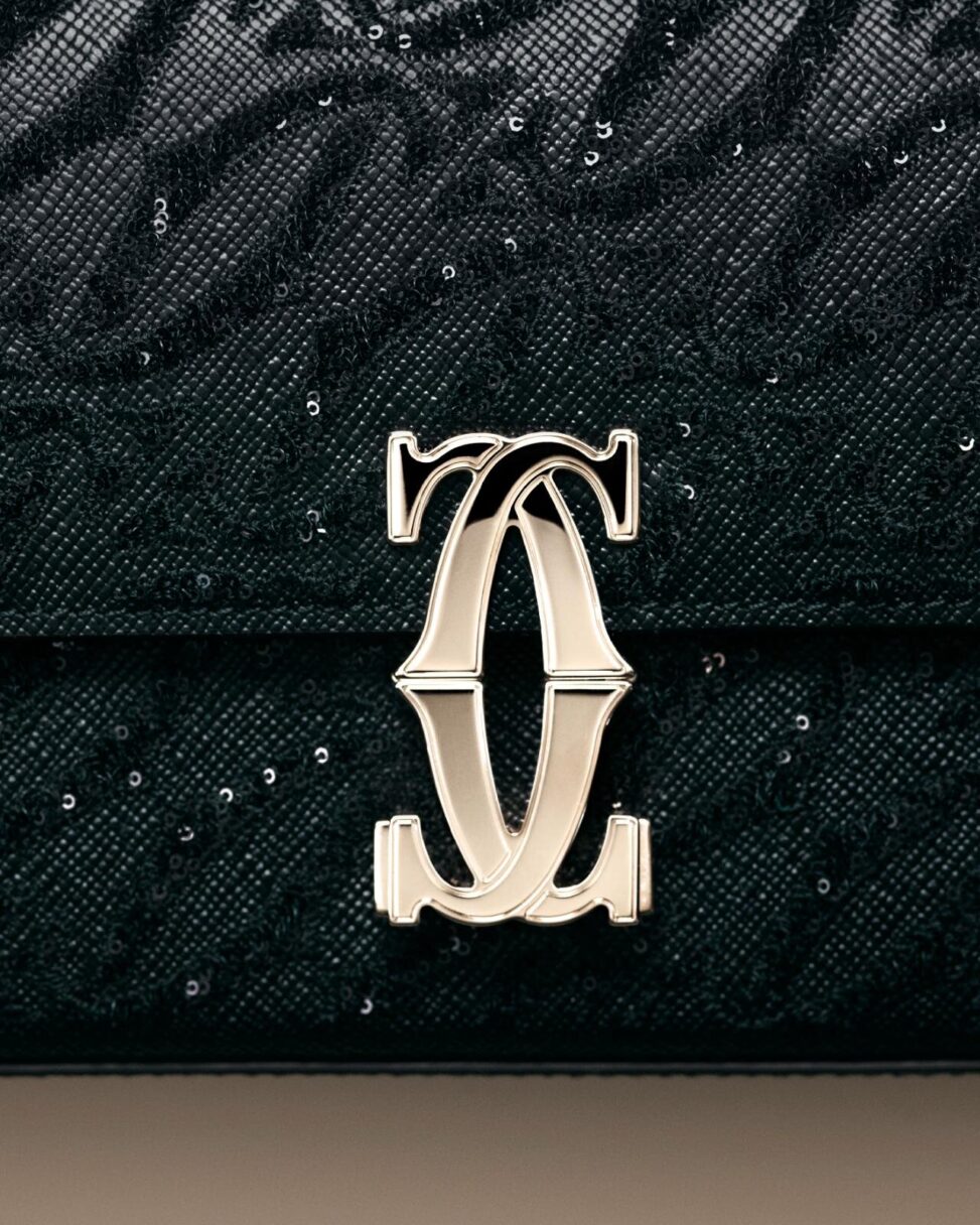 また、カーフレザーを使用した「C ドゥ カルティエ(C de Cartier)」ミニチェーンバッグも登場。メゾンのイニシャル刺繍にスパンコールを散りばめ、ブラックレザーの艶めきとゴールドの金具が織りなすコントラストが、洗練された印象を与える。小ぶりながらも存在感があり、デイリーからイブニングシーンまで幅広く活躍してくれる。