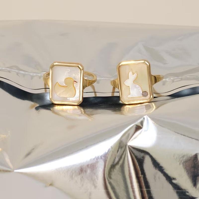 アヒルとウサギのモチーフは、ゴールドとマザーパールを組み合わせた柔らかい表情が魅力。四角いプレートの中にモチーフを閉じ込めたデザインは、まるで小さな絵画のようで、胸元に個性的なアクセントをもたらしてくれる。ネックレスやリングとして展開され、シンプルながらも存在感のある仕上がりだ。