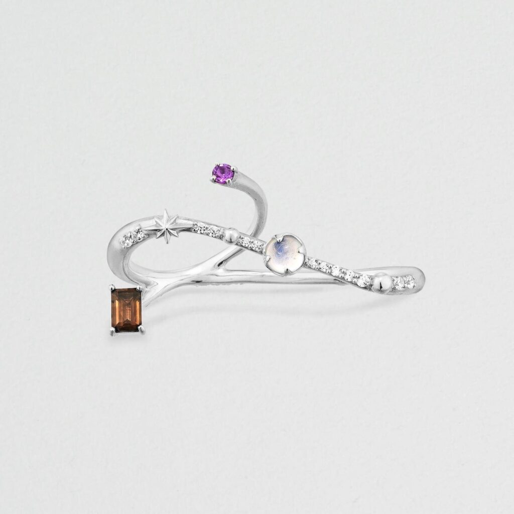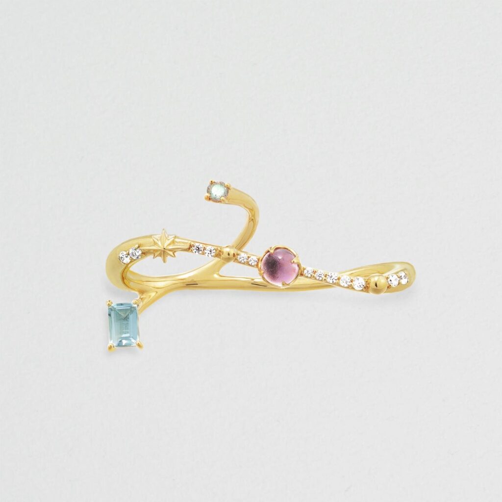 リング全体には、アメシストやブルートパーズ、ラブラドライトなど、色彩豊かなカラーストーンを散りばめ、宇宙の神秘とロマンティックな浮遊感を表現。八芒星をモチーフにしたディテールがアクセントとなり、繊細さと華やかさを兼ね備えたデザインに仕上がっている。