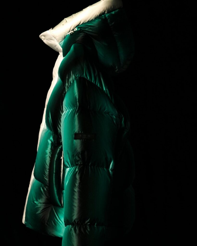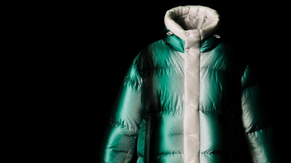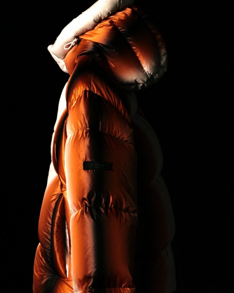 今回のコレクションの着想源は、日本の漆芸における伝統技法「ぼかし塗り」。幾重にも塗り重ねられた漆が生み出す繊細な光のグラデーションや奥行きを、ダウンジャケットやバッグなどのファッションアイテムへと昇華している。滑らかな素材の中に、橙と緑の色が淡く移り変わる様は、まるで一つのアートピースのようだ。