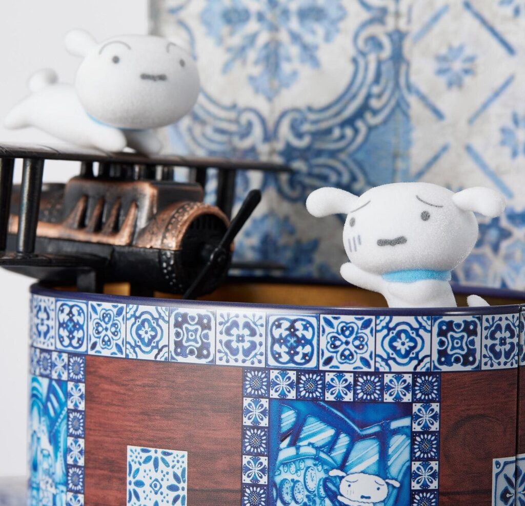 缶の側面には、しんちゃんたちが飛行機でお城を目指すまでのストーリーを、ヨーロッパのタイルを思わせるデザインで描写。座席でリラックスするひまわりや、操縦を任されて慌てるシロなど、4種類のイラストがぐるりと並ぶ。さらに、缶の底をめくるとレトロな飛行機とひまわりの隠しイラストが登場するという遊び心も満点。眺めているだけでもワクワクする仕掛けが満載だ。