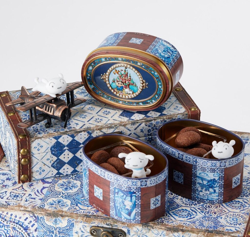 今回のクッキー缶は、しんちゃん・シロ・ひまわりが“空の旅”に出かける物語をテーマにデザイン。缶の蓋には、おめかししたしんちゃんとシロが、お城の前で記念撮影するシーンをエンボス加工で表現し、周囲をパール風の額縁で囲んだ。キラキラと輝くその姿は、まるで宝石箱のような可愛らしさだ。