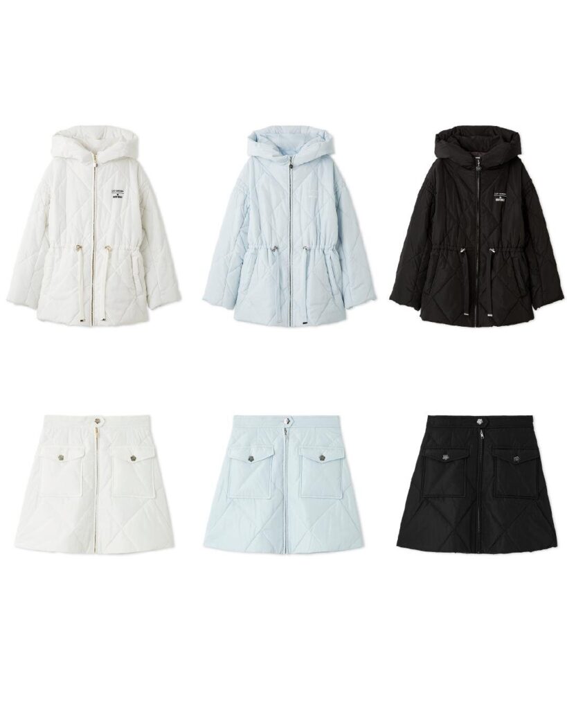 なかでも注目はアウター。キルティング素材の「パッファーコート」は、ウエストのドローコードでシルエットを自在に調整できるデザイン。深めのフードやデイジーモチーフのチャーム、輝くシルバーパーツが上品なアクセントを添える。カラーはホワイト、ブラックに加え、淡いライトブルーも展開。同素材のミニスカートと合わせれば統一感のあるセットアップコーデが完成する。