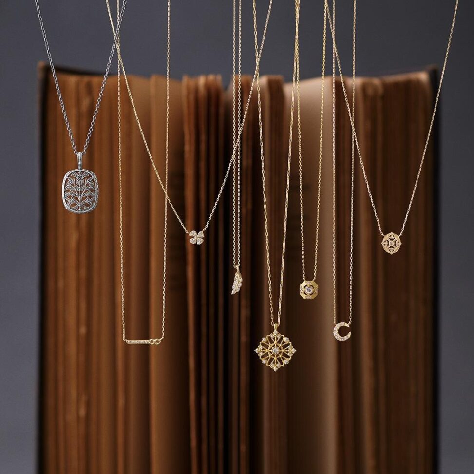ネックレスは、クローバーや教会のバラ窓を思わせる透かし模様をデザイン。ゴールドやシルバーのベースに繊細な細工を施し、特にシルバーには燻し加工を加えることでアンティークのような奥行きを感じさせる。小粒のダイヤモンドをあしらいながらも、肌になじむ柔らかな輝きで、普段使いにもぴったり。