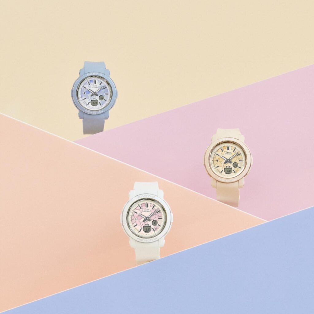 新作「BGA-290FL」は、ブルー、ピンク、ホワイトの柔らかなカラーリングを基調とした3色展開。文字板には花のモチーフをあしらい、9時位置のインデックスにはクリスタルをセット。花の中心のように輝くポイントが、手元に上品な華やかさを添える。