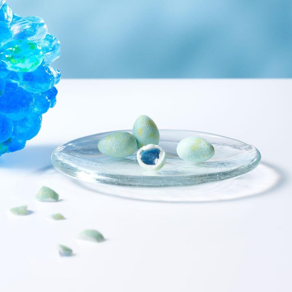 新作「空想果実 イトピスの実」は、深い海の青を思わせる鮮やかなブルーカラーが特徴。形状は涙のように丸みを帯びた“しずく型”で、思わず手に取りたくなるような可憐なフォルムだ。外側はパリッとしたハードな食感で、まるで果皮を噛みしめるような心地よい歯ごたえ。内側は柔らかく、果肉をイメージしたジューシーなテクスチャーになっている。外と中で異なる2層構造が生み出す食感のコントラストが楽しく、ひと口ごとにクセになる。