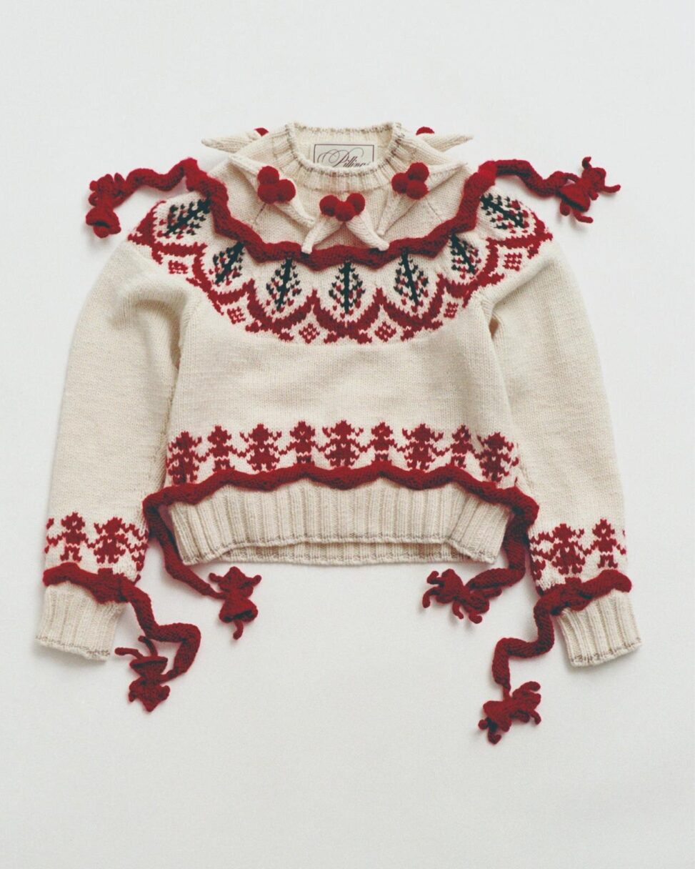 今年の主役となるのは、サンタクロースの仕事を手伝ったり、子どもたちの行いをそっと見守ったりすると言われる“小人の妖精=クリスマスドワーフ”をテーマにしたニット。にぎやかに並ぶドワーフやクリスマスツリーを編み柄で描き、見ているだけで気持ちがほぐれるような温もりのあるデザインに仕上げた。特に目を引くのは、ドワーフのモチーフがニットから立体的に飛び出すユニークな仕様。まるで絵本の世界がそのまま飛び出したかのような遊び心が詰まっている。