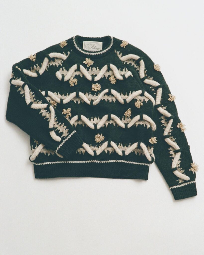 また、古くから“幸運を呼ぶシンボル”として愛されてきたクリスマスリースをモチーフにしたセーターも登場。深みのあるダークグリーンをベースに、ロープ状の編み地をウェーブのようにあしらい、さらに星形モチーフを散りばめることで、陰影のある表情豊かな1着へと仕上げている。存在感がありながらも、大人の日常コーデにも溶け込むほど洗練された佇まいだ。