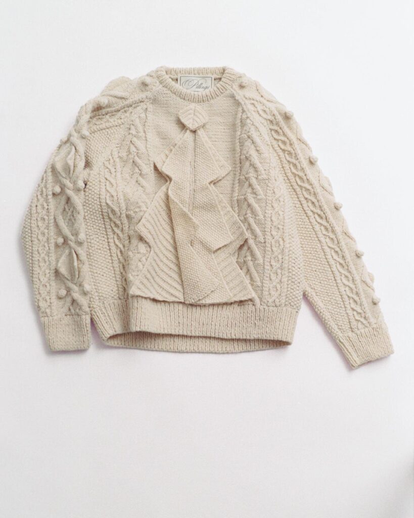 さらに、定番人気のアイボリーアランニットには、大きなクリスマスツリーのモチーフを大胆にオン。編み地の凹凸によって立体感が生まれ、動きのあるデザインがホリデーらしいワクワク感を演出する。着るだけで気分が華やぐような、冬ならではの一枚だ。