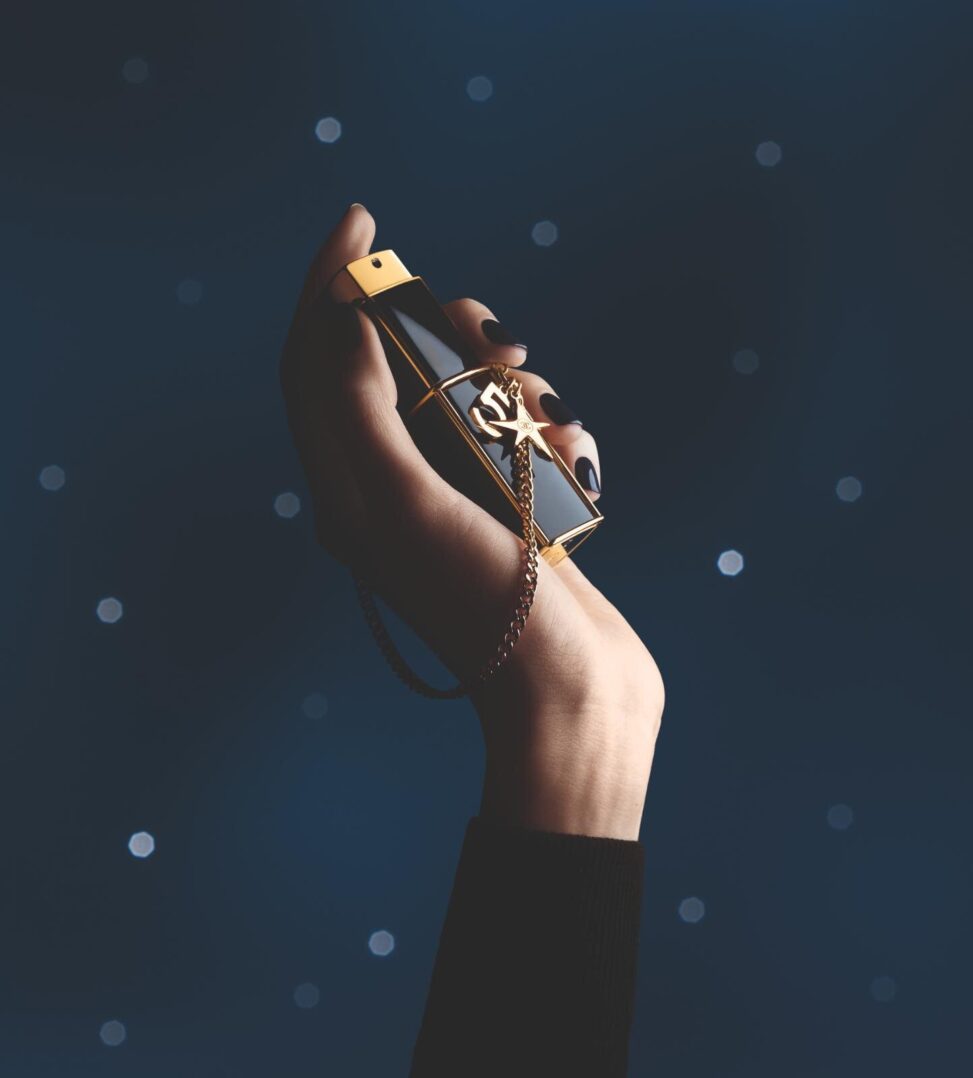 深みのあるブラックを基調としたケースに、繊細なゴールドの縁取りをあしらい、さらに手元で揺れるゴールドチェーンを組み合わせたデザインは、まるで一点物のアクセサリーのよう。ガブリエル シャネルが愛した“ラッキーナンバー5”と、希望や幸運を象徴するコメット(彗星)のチャームを添えることで、お守りのような存在感を放つ特別仕様となった。
