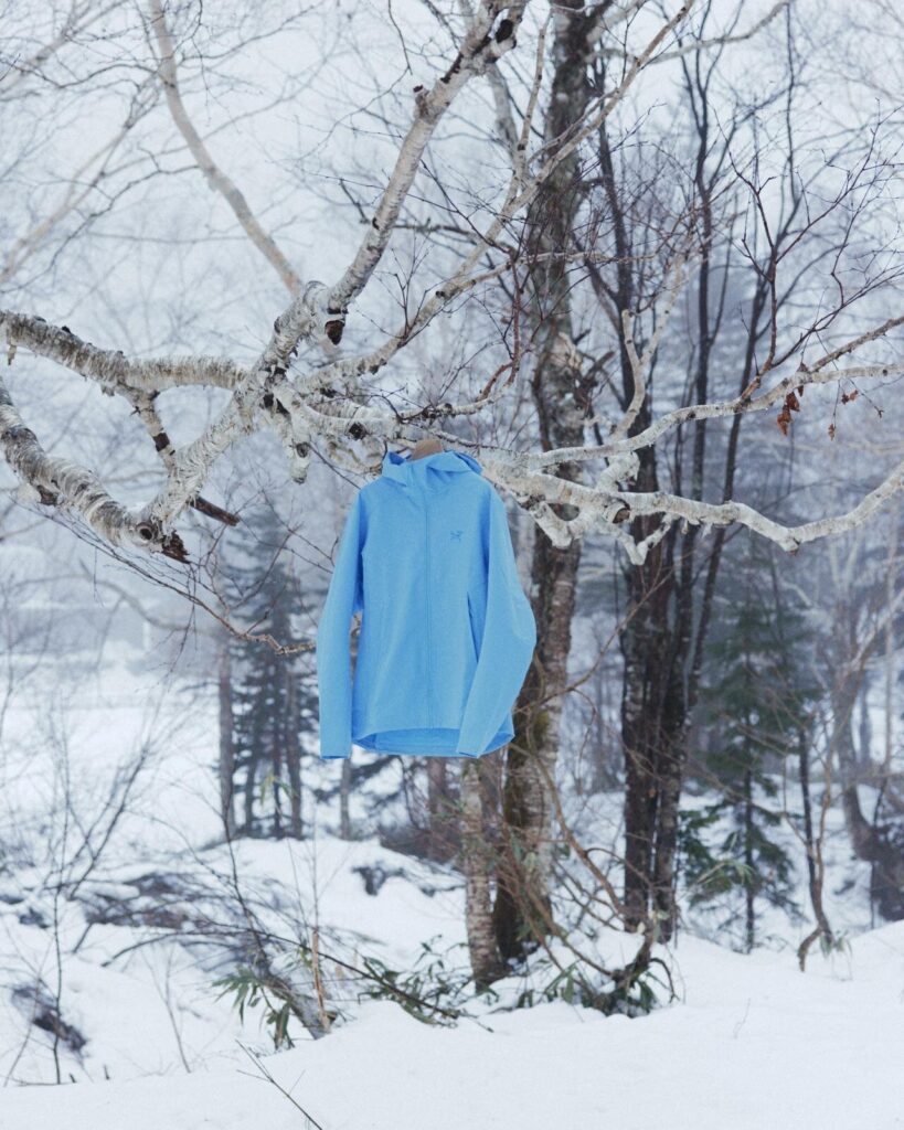 今回の限定コレクションは、ウェア3型とアクセサリー2型、計5点で構成されたミニカプセルライン。テーマとなったのは、アークテリクスが本拠地を置くカナダ・ブリティッシュコロンビア州のブラックコム氷河。その奥に冬の間だけ姿を現す“氷の洞窟”だ。光を受けて青く輝く氷壁や、凛とした静寂をまとった空気の透明感から着想し、全体を神秘的なブルーのワントーンでまとめているのが特徴である。