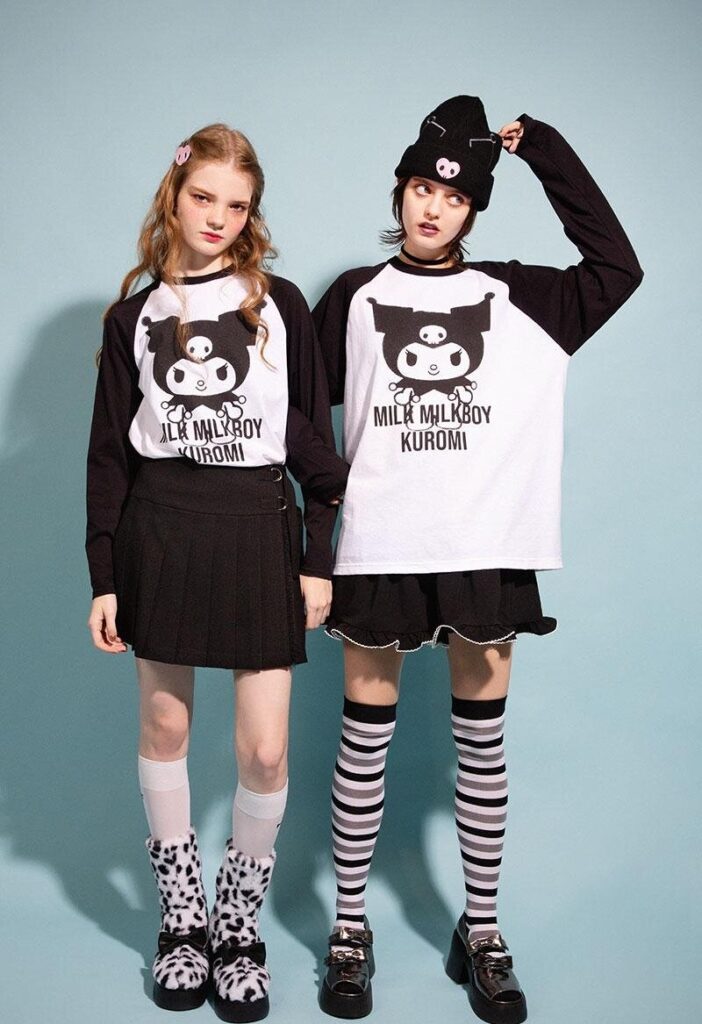 クロミを大胆にプリントしたロングスリーブTシャツも存在感たっぷり。ブラックとホワイトのモノトーン配色に、ミルク・ミルクボーイ・クロミの3つのネームを組み合わせ、ちょっぴりロックな雰囲気も感じさせる一着だ。