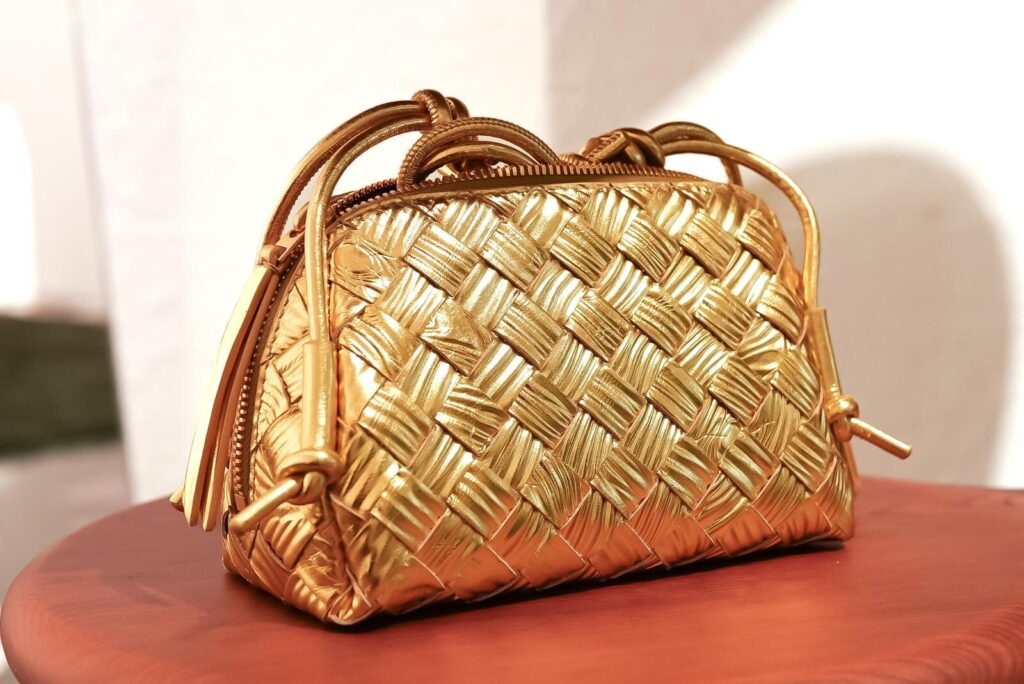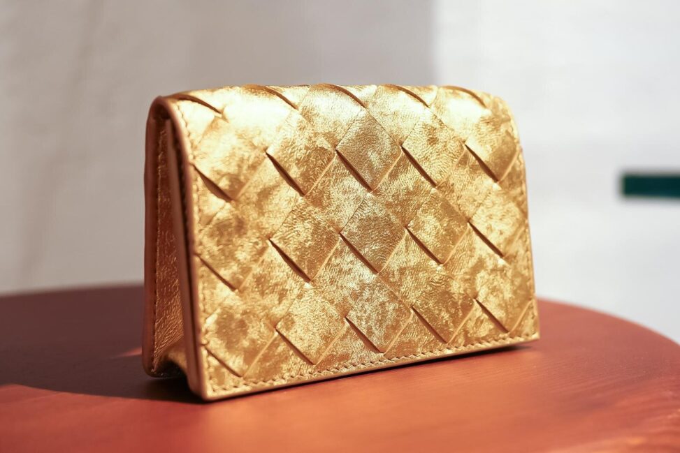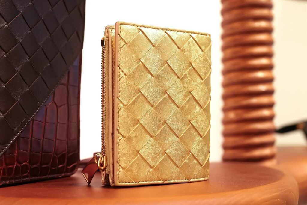 今回のコレクションで主役となるのは、落ち着いた光沢感のゴールドカラーで仕上げたレザーアイテム。表面には控えめなツヤを放つラミネートレザーを採用し、ブランドの象徴である“イントレチャート”を繊細に編み込んだ、奥行きのある質感が魅力だ。手に取る角度でさりげなく光が揺れ、ホリデーシーズンらしい特別感を演出してくれる。