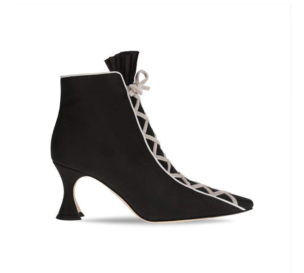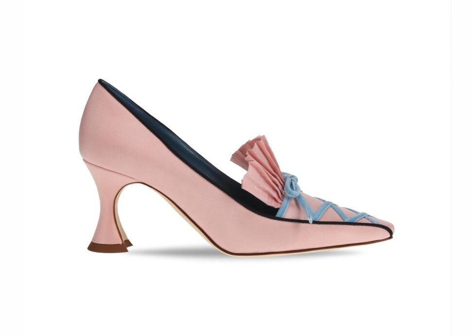 今回のカプセルコレクションは、マリー・アントワネットの装いに見られる繊細なディテールを、シューズのフォルムに落とし込んだ点が最大の魅力だ。パステルピンクやミストブルーなど、ロココ時代を象徴する柔らかな色合いを基調とし、コルセットドレスを思わせるレースアップのリボンや、宮廷衣装に見られるプリーツを巧みに配置。動くたびに陰影が生まれる装飾が、足元をいっそうドラマティックに演出してくれる。