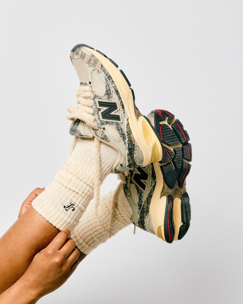 アッパーには、立体感のあるブークレ素材を採用。細かいループ状の糸が生み出す凹凸とプリントの濃淡が重なり、履き始めから“使い込まれたような表情”を演出するのが特徴だ。モデル本来の構造はそのまま踏襲し、通気性に優れたダイヤモンドニットメッシュ、ミッドフットを支えるTPUパーツなど、オリジナルの安定性・快適性をしっかり保持している。