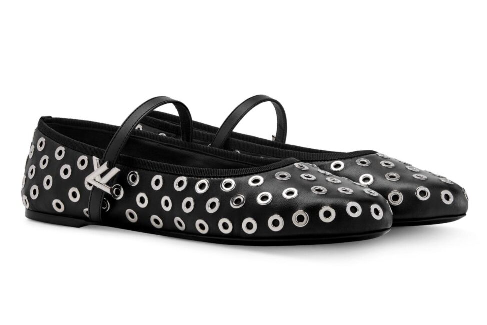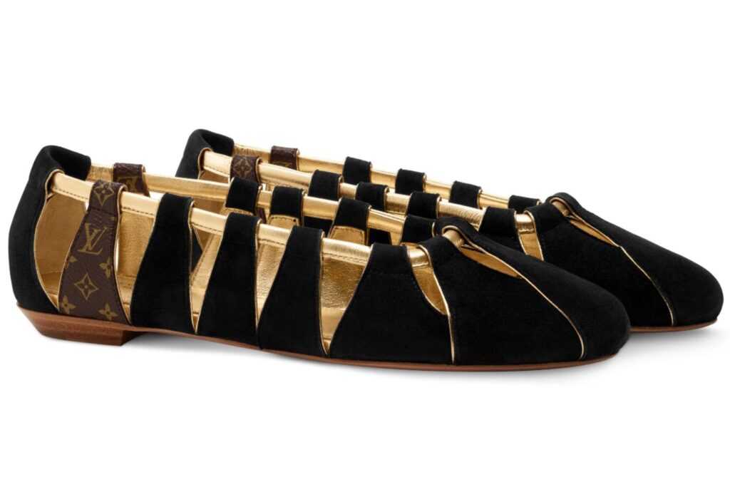 まず注目したいのは、クラシックなバレエシューズを鎧モチーフで再解釈した「ロミー バレリーナ」。ラムレザーの柔らかさを活かしながら、アッパー全体にシルバーカラーのアイレットを規則的に配置し、まるで金属の装飾を纏ったような独特の表情に仕上げている。ラウンドトウのフォルムに細めのストラップを組み合わせ、フロントにはLV ツイストのアクセサリーを添えて華やかさをプラス。アウトソールには上質なレザーを採用し、軽快さと気品を同時に叶えている。