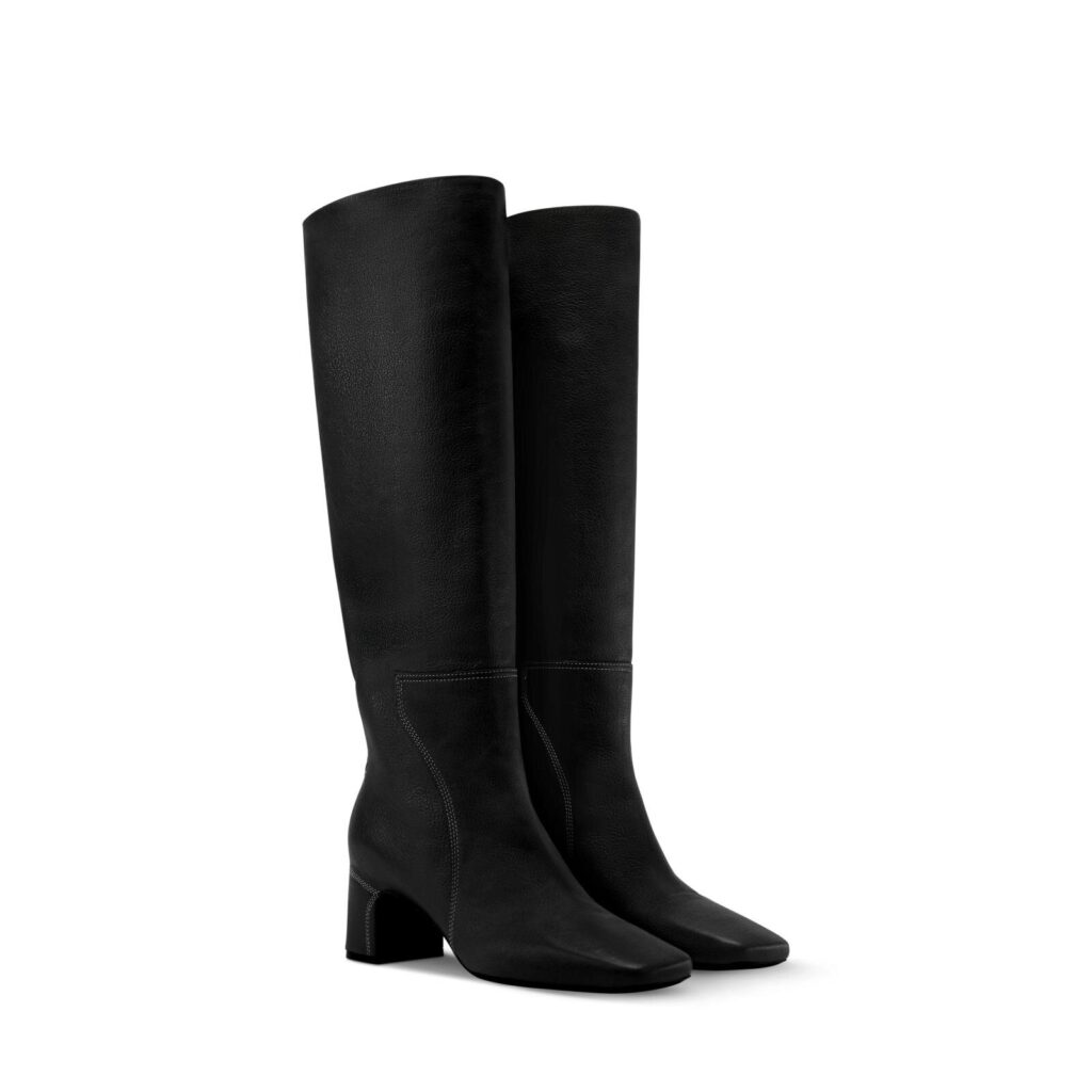 3型目となる「アヴァロン ハイブーツ」は、鎧の重厚感を思わせる存在感が魅力のロングブーツ。スクエアトウとしっかりとしたブロックヒールの組み合わせにより、力強いシルエットを形づくっている。素材にはしなやかなグレインカーフレザーを使用し、筒部分は継ぎ目を最小限にした滑らかなラインに整えることで、上質さとモダンさが調和したデザインに。背面にはモノグラム・キャンバスのループタブが配され、さりげないアクセントとなっている。ジッパーを排した引き上げ式の構造で、見た目はシンプルながら着脱しやすい仕様も嬉しいポイントだ。