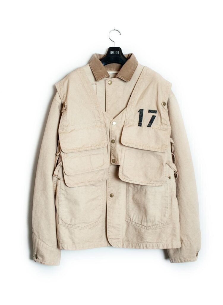 コレクションの中心となるのは、「大砲の街」に登場する少年の衣装に着想を得たカバーオールセット。ベストは着脱可能で、外すと内部に『MEMORIES』3作品の象徴的な場面が浮かび上がる仕掛けが施されている。さらに、カバーオール自体を変形させてバッグとして使えるなど、セヴシグらしいギミックが存分に詰め込まれている。
