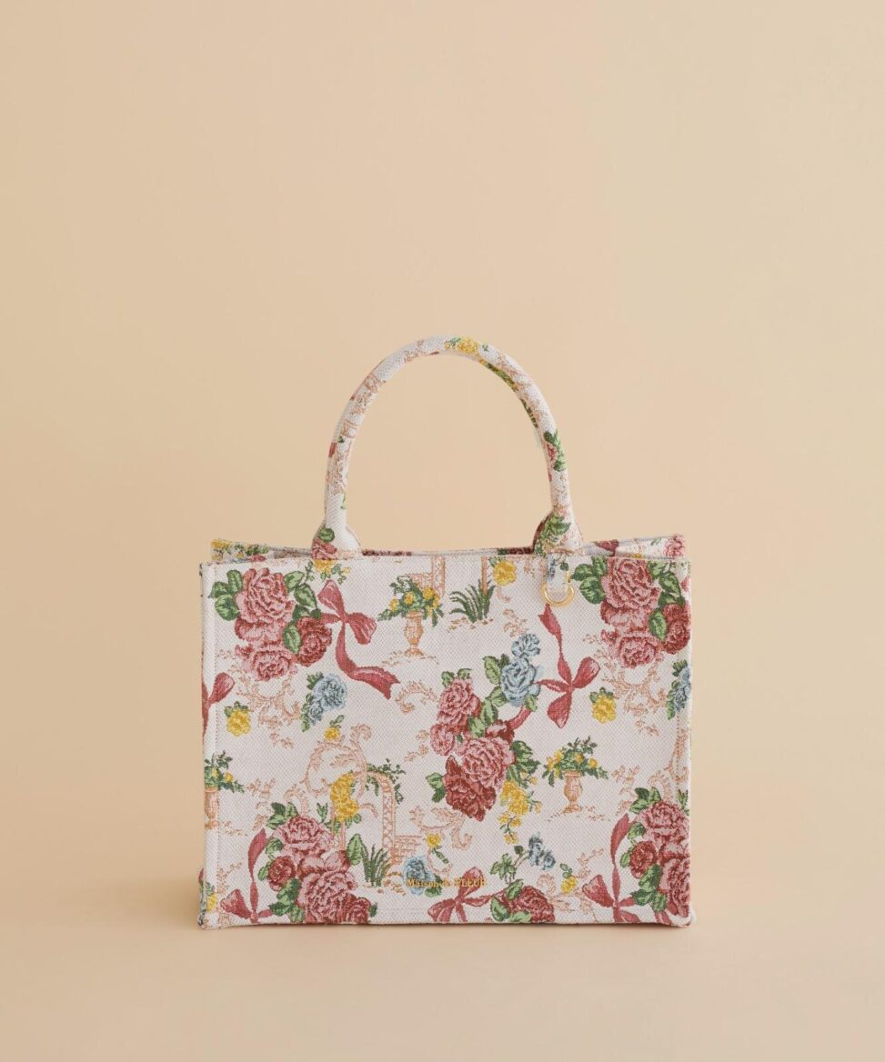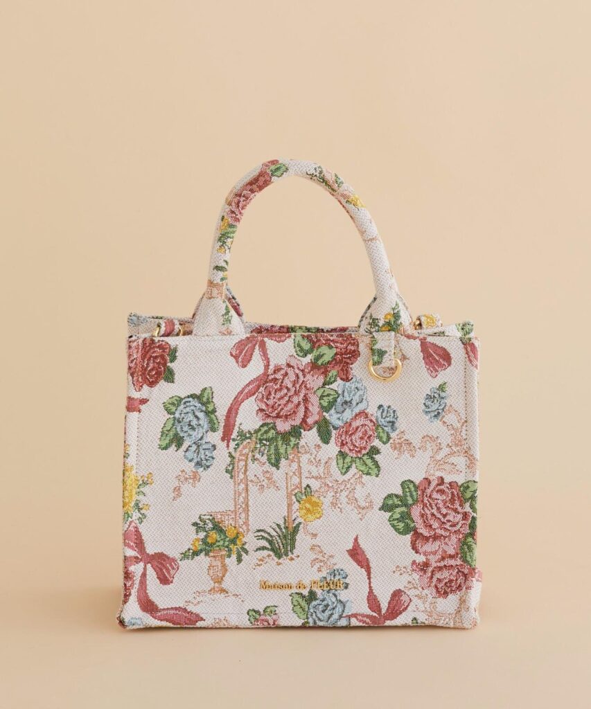 今回のテーマは “冬の庭”。凛とした空気が漂う季節の庭園をイメージし、フランス製のゴブラン生地にクリスマスムードを感じさせる花々と赤いリボンを織り込んだ、繊細で温かみのあるデザインが特徴だ。クラシカルで気品のある雰囲気を漂わせつつ、日常使いしやすいバッグとして仕上げられている。