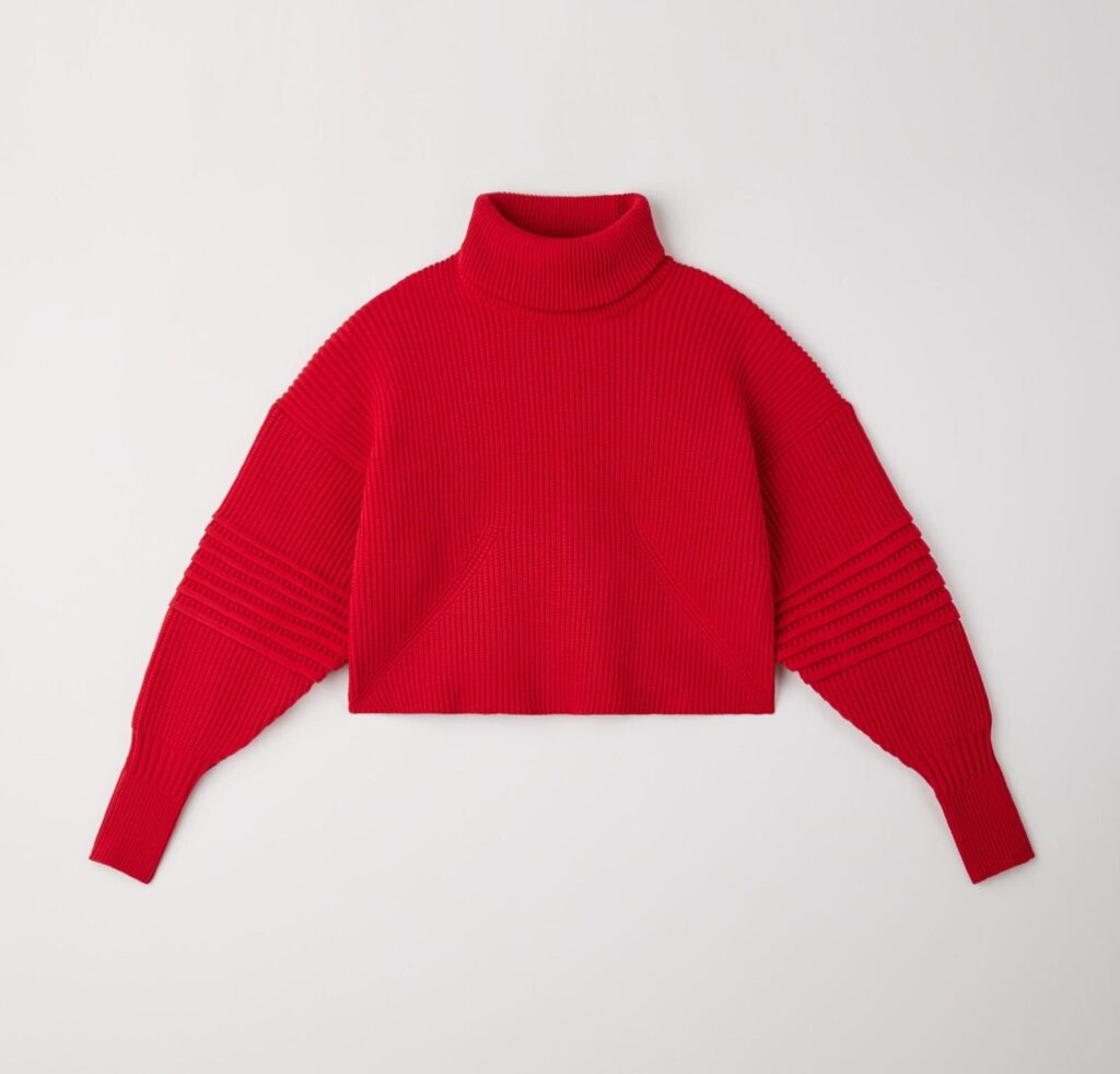 今回登場するニットは、鮮やかなレッドを基調にしたホリデーシーズン限定の1着。ゆったりとした丸みのあるアームラインには、7本の立体ピンタックが施され、動きに合わせて柔らかく陰影が生まれる。ざっくりとしたローゲージ編みと立ち上がりの良いハイネックがメリハリを生み、ショート丈のバランスと相まってスタイリングの主役になるアイテムだ。