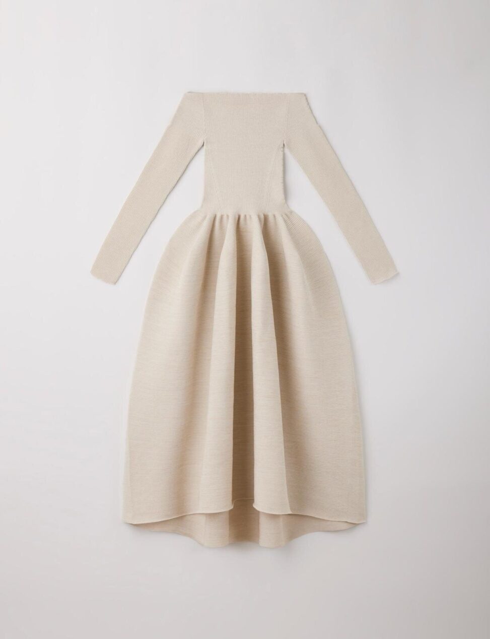 さらに、新店と「CFCL 六本木」でのみ手に入る限定アイテムもラインナップ。ブランドを象徴する壺型フォルム「ポッタリー(POTTERY)」シリーズからは、グリッターを散りばめた華やかなロングドレスが登場。オフショルダータイプとベルスリーブタイプの2モデルが用意され、冬のイベントシーズンをより特別に演出してくれる。