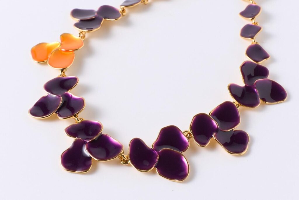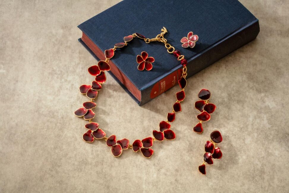 最初に注目したいのは、深みのある“ルージュレッド”をまとったフラワーモチーフのシリーズ。大輪の花や花びらを立体的に連ねた有機的なシルエットに、職人の手仕事によるエマイユの艶やかなレッドを重ねることで、冬の装いを華やかに彩るジュエリーへと仕上げた。特にリングやネックレスは、コーディネートの主役になる存在感を放つ。
