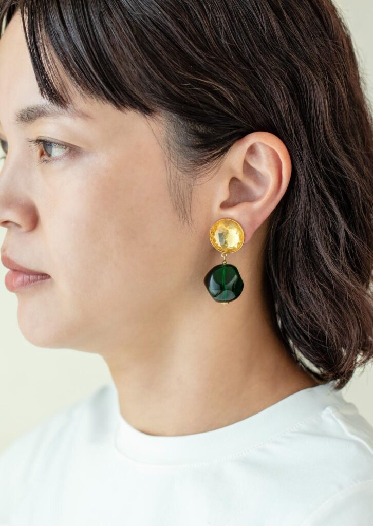 また、まるでキャンディのようにコロンと愛らしいガラスジュエリーもラインナップ。レッド×グリーン×ゴールドというクリスマスらしい配色で作られたピアスやネックレスは、透明感のあるガラスパーツが連なり、揺れるたび光を受けてきらめく仕上がり。ホリデーシーズンの気分を高めてくれるアイテムだ。