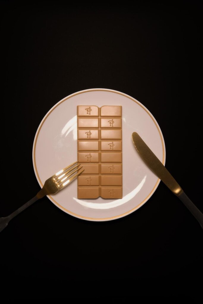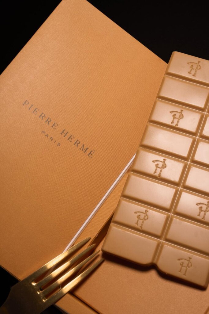 今回のショコラは、ミュシャが愛用していたスケッチブックから着想を得た“アートブック風”のパッケージが特徴。開くときの感覚まで楽しめるよう綿密に作られたブック型ボックスは、まるで作品集を手に取るような特別感がある。蓋を開くと、ピエール・エルメ・パリが創り上げたブロンドチョコレートが静かに姿を現し、ブランドロゴを刻んだ端正なタブレットが視覚的にも美しい。