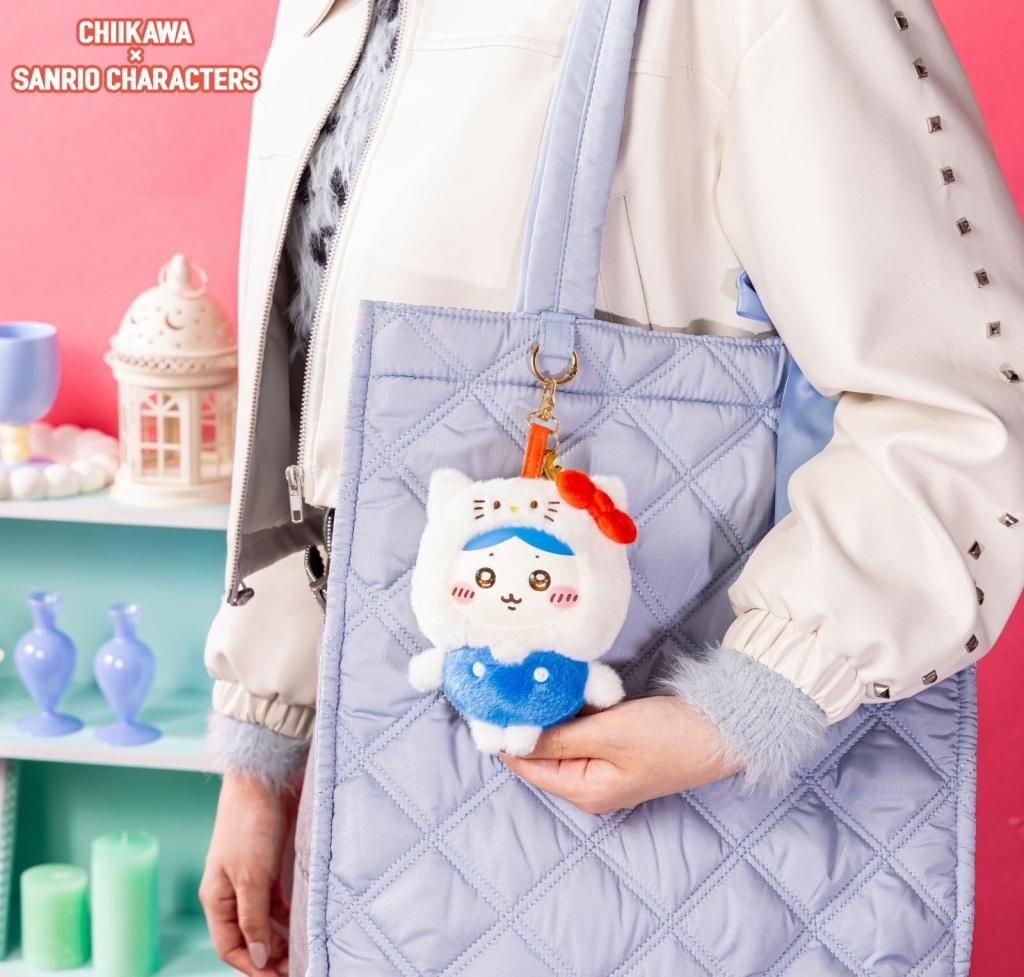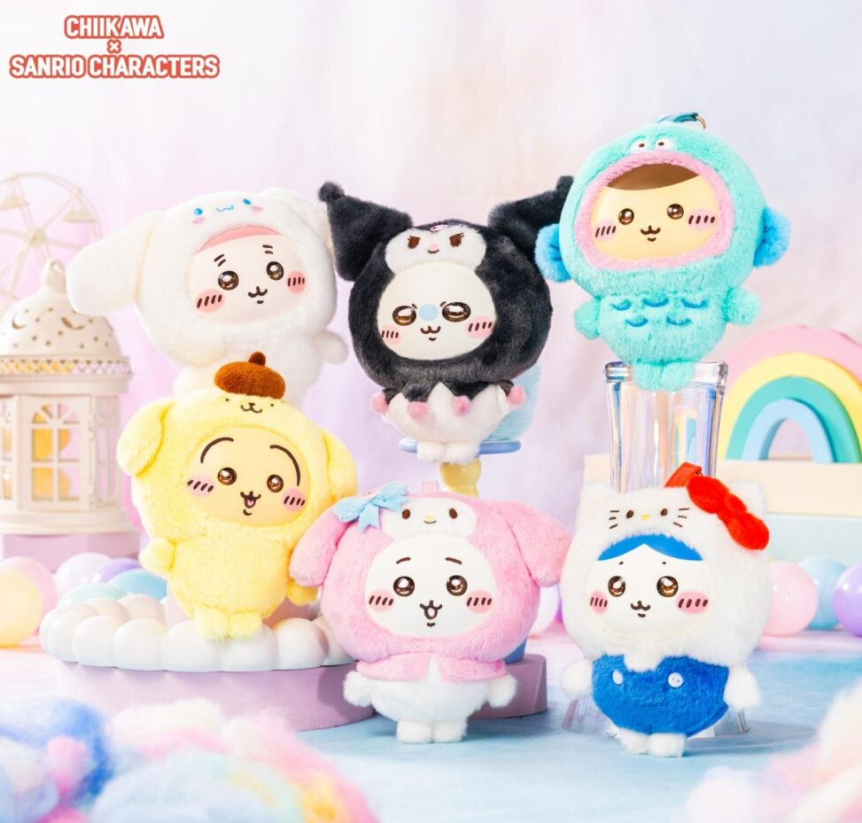 まず注目したいのは、アクセサリーぬいぐるみブランド「きらめっこ(Kiramekko)」から登場する限定ぬいぐるみシリーズ。ちいかわたちがサンリオキャラクターズの着ぐるみを身にまとい、思わず抱きしめたくなるほどキュートな姿に変身している。