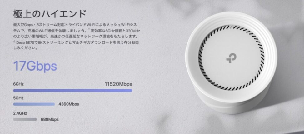通信速度や安定性を大幅に向上させたいなら、今後の主流になるWi-Fi 7(IEEE 802.11be)対応ルーターへのアップデートがおすすめ。特に「Deco BE75」は、10Gbps対応のWANポートを搭載しており、自宅の光回線を最大限に活かすことができる。