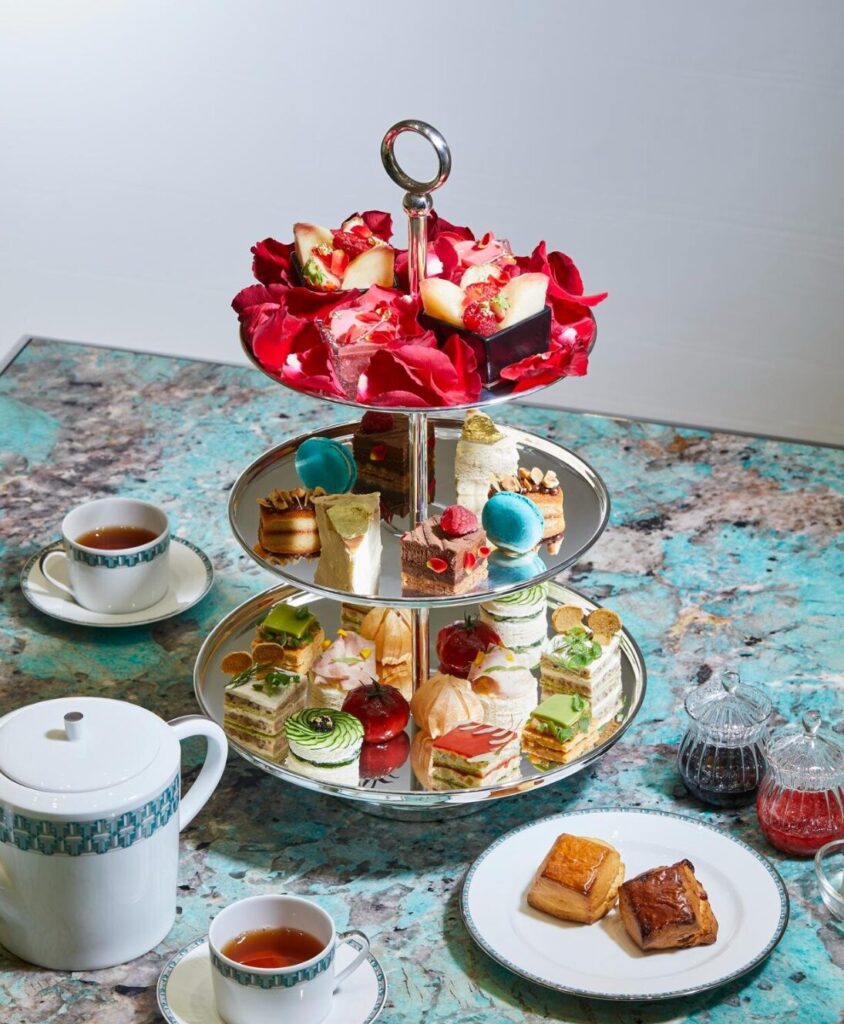 午後には、華やかな3段スタンドで供される「ティファニー アフタヌーンティー」がおすすめ。1段目には庄司氏の代表作フルーツタルト、2段目にはティファニー ブルーのマカロンやバニラチーズケーキなどのデザート、3段目には胡瓜のサンドウィッチやクラブサンドなどのセイボリーが並びます。