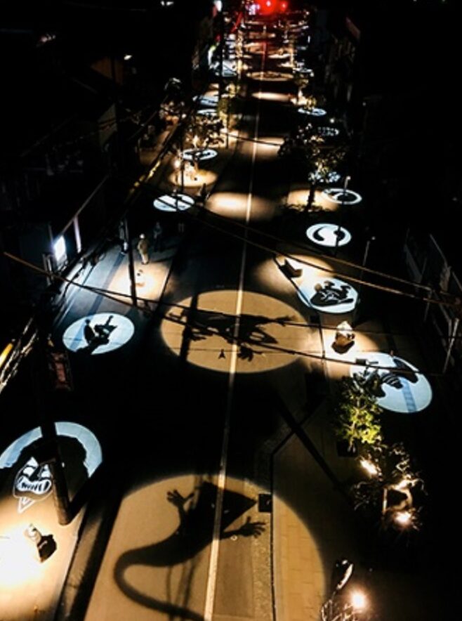 日没から午後10時まで、妖怪たちの影絵が道に映し出され、ブロンズ像もライトアップ。昼間とは違った幻想的な雰囲気が漂い、夜の妖怪探索が楽しめます。