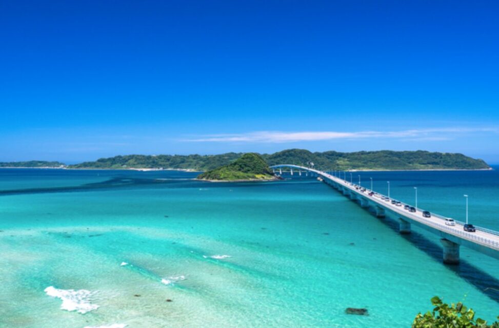 山口県下関市豊北町沖に浮かぶ周囲約17kmの小さな島、角島は、透明度の高いコバルトブルーの海と豊かな緑が魅力のリゾートスポットです。美しい「角島大橋」を渡ると、白い砂浜と青い海が広がる非日常の世界が待っています。