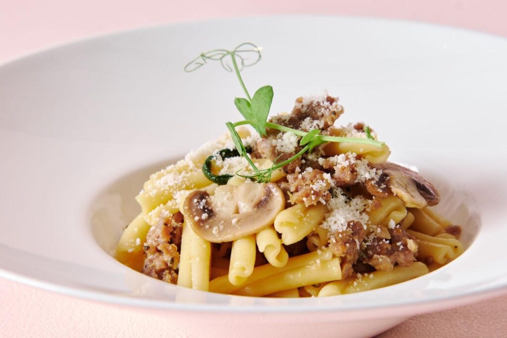 中段には、モノクロストライプが映えるケーキ、紅茶ムースをクッキーでサンドしナッツやドライフルーツで食感をプラスした一品、そして栗の上品な甘さを閉じ込めたマロンタルトが勢ぞろい。セイボリーには竹炭バンズの“ゴシックバーガー”が主役として登場。燻製の香り豊かなBBQソースが旨みを引き立てるほか、カリフラワーのデビルスープ、オリーブフリットとモッツァレラチーズもラインナップされている。