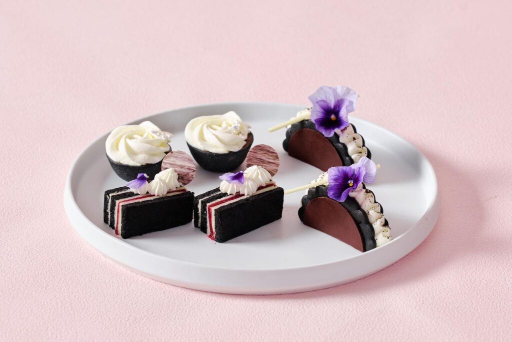 今回のアフタヌーンティーでは、旬を迎える栗やぶどうとハーゲンダッツの濃厚なアイスクリームを組み合わせた、白と黒を基調とする可憐なスイーツが並ぶ。上段には「スイートチョコレート」フレーバーのコーンアイスクリームをはじめ、カシスとショコラが絶妙にマッチした「カシスガナッシュマカロン」、そして繊細な花飾りが目を引く「コーヒーゼリー~バニラアイス添え~」が並び、視覚と味覚の両方を楽しませる。