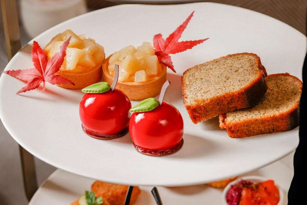 紅茶をテーマにしたスイーツも充実。「紅茶とりんごの真っ赤なムース」は、鮮やかなりんご型のビジュアルが印象的で、紅茶の香りとりんごの甘酸っぱさが口いっぱいに広がる。「洋梨タルト」はジューシーな洋梨をたっぷりのせ、秋らしい上品な味わいに。「紅茶のパウンドケーキ」は、茶葉を練り込んだしっとり生地で、ティータイムにぴったりだ。