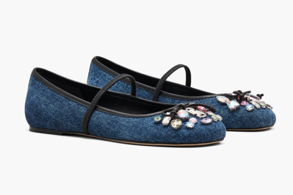 注目アイテムのひとつが、ランウェイコレクションから着想を得た「サブリナ バレリーナ」。フロントには色とりどりのカラージェムを敷き詰め、中央にブランドを象徴する「J」マークと繊細なリボンを配置。アッパーにはデニム素材を採用し、華やかさの中にカジュアルなニュアンスを添えている。