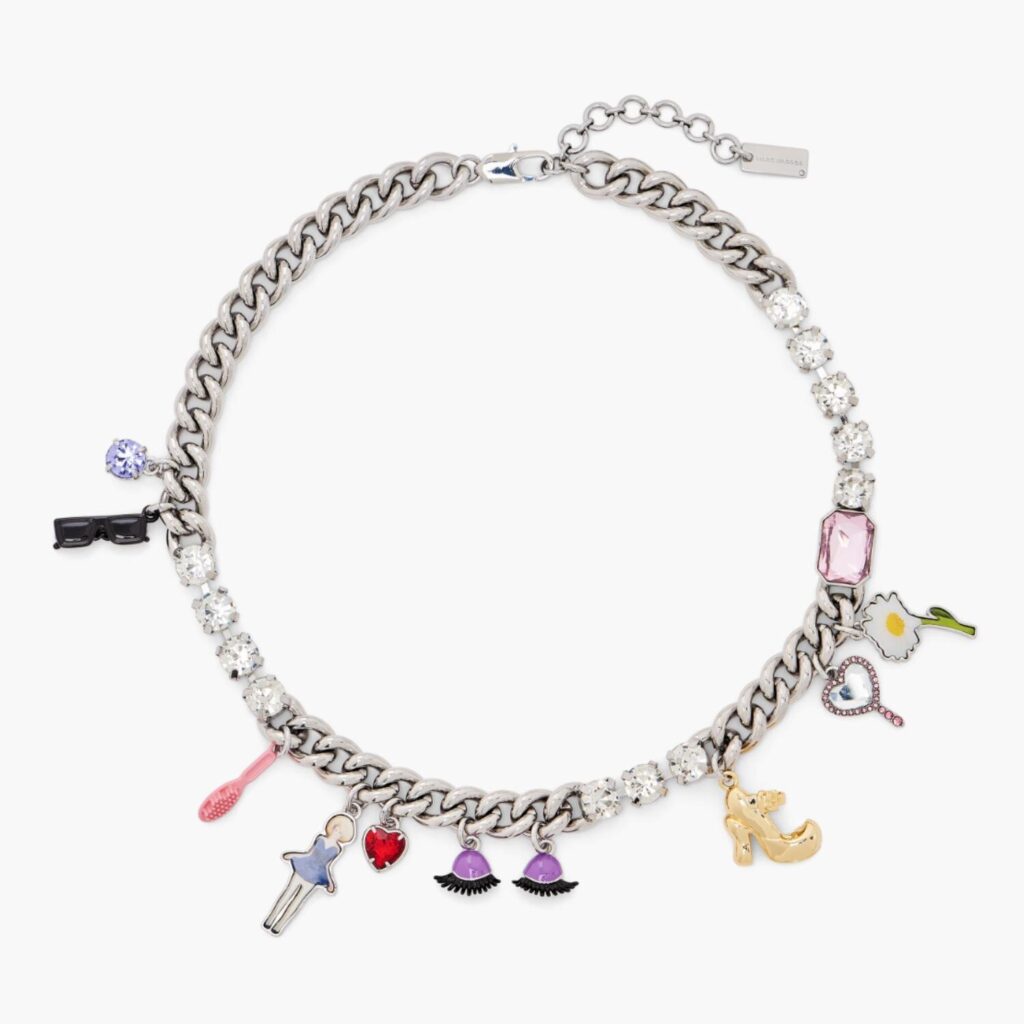 アクセサリーからは、ドールハウスをテーマにしたチャームネックレスが登場。人形や手鏡、輝くハイヒール、櫛などのモチーフをミニチュアで再現し、太めのシルバーチェーンの間にはクリスタルチャームを忍ばせている。遊び心あふれるデザインで、装いのアクセントにぴったりだ。