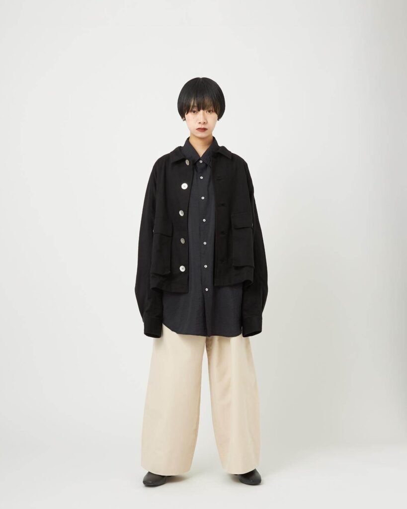 今季の目玉アイテムのひとつが、新たにラインナップされるブルゾン。両面起毛を施したコットンカツラギ素材を採用し、優しい肌触りとあたたかみのある風合いが魅力となっている。ボディ部分にはマチ付きの大きなフラップポケットを配し、ワークウェアの要素を取り入れたデザイン。銀色に輝くメタルボタンをフロントに並べることで、カジュアルさの中にモダンなエッセンスを加えている。着丈を短めに設定したコンパクトなシルエットも特徴で、レイヤードスタイルでもすっきりとまとまりやすく、都会的なムードを漂わせるブルゾンに仕上がった。