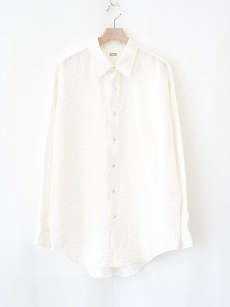 一方、上品な光沢を放つシルクナイロンを使用したスカーフカラーシャツも注目の一着。塩縮加工による独特のシワ感と柔らかな質感が魅力で、長く垂れた襟はアレンジ自在。メタルリングに通したり、軽く結んだりすることで多彩な表情を見せる。カラーはホワイトとブラックの2色が展開され、ユニセックスで楽しめるデザインとなっている。