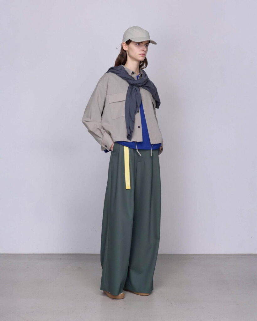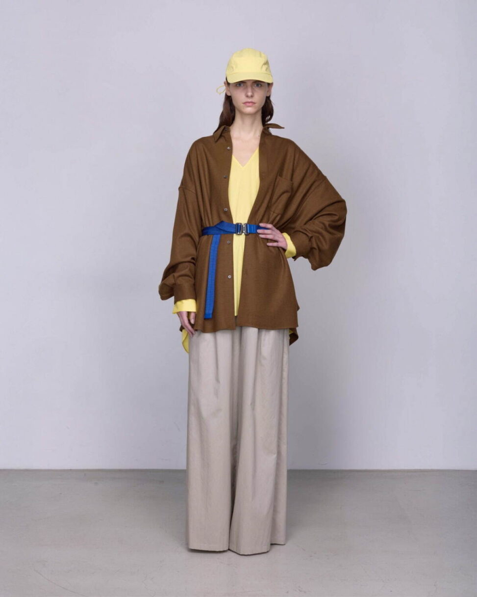 注目すべきは、こうしたミニマルなシルエットに“配置”によるリズムを生み出すスタイリングだ。グリーンを基調にしたニットトップスに、レモンイエローのグローブやシャツ、さらにスヌードを重ねることで、抽象画のように鮮やかな表情を構築。色味の異なるノーカラージャンパーやロングシャツ、ワイドパンツを重ねることで奥行きを表現したルックも印象的である。