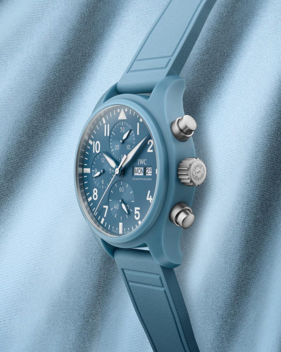 限定モデル「パイロット・ウォッチ・クロノグラフ 41 “トップガン・ミラマー”」は、直径41.9mmのライトブルー・セラミックケースを採用。文字盤から撥水加工を施したラバーストラップに至るまで同色で統一し、シンプルでありながら存在感のあるデザインに仕上がっている。針にはスーパールミノバを塗布し、暗所でも高い視認性を確保。ミリタリー由来の堅牢性と都会的なカラーリングが融合した、他にない一本となっている。