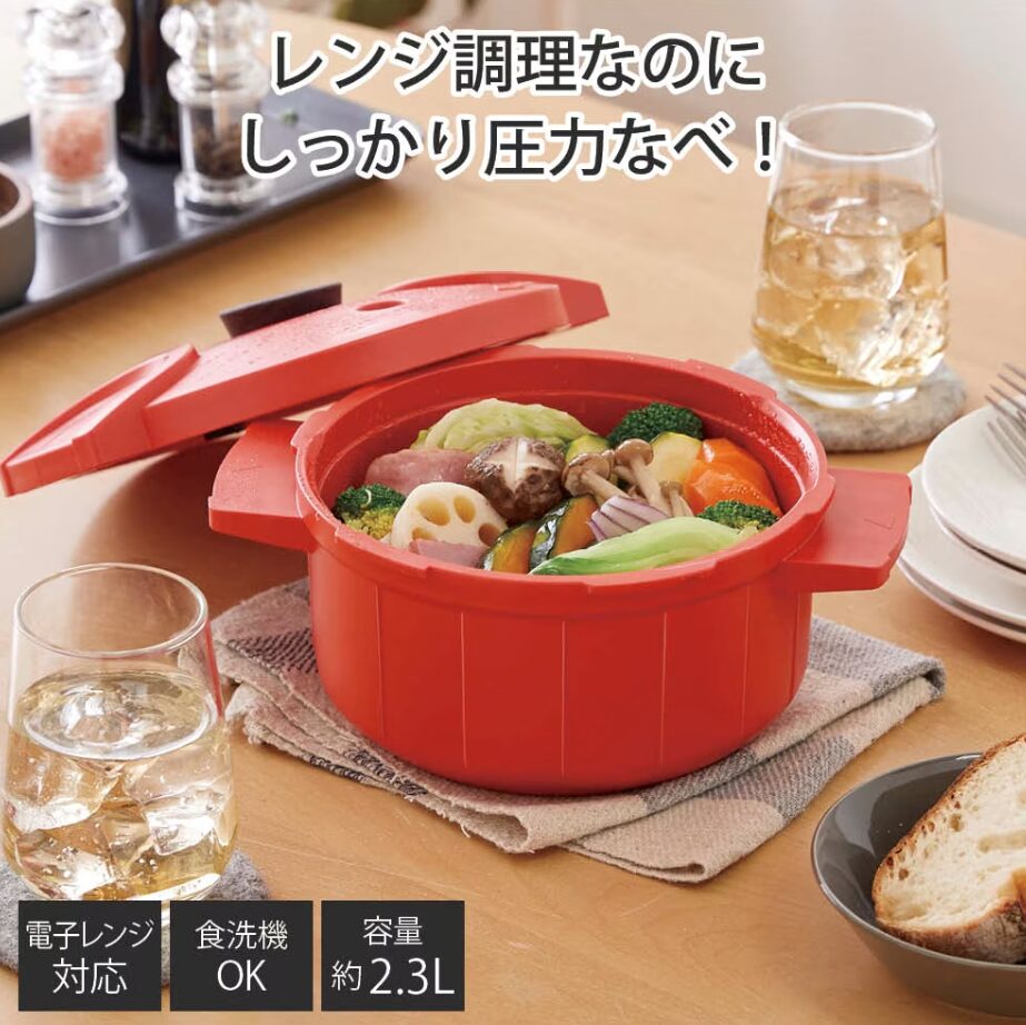 プラスチック製で重さはわずか約980gと軽量。材料を入れて電子レンジにかけるだけで、筑前煮やカレー、炊き込みご飯まで作れる本格派。火を使わないので安全で、忙しい方や一人暮らしの方にもぴったりの調理アイテムです。