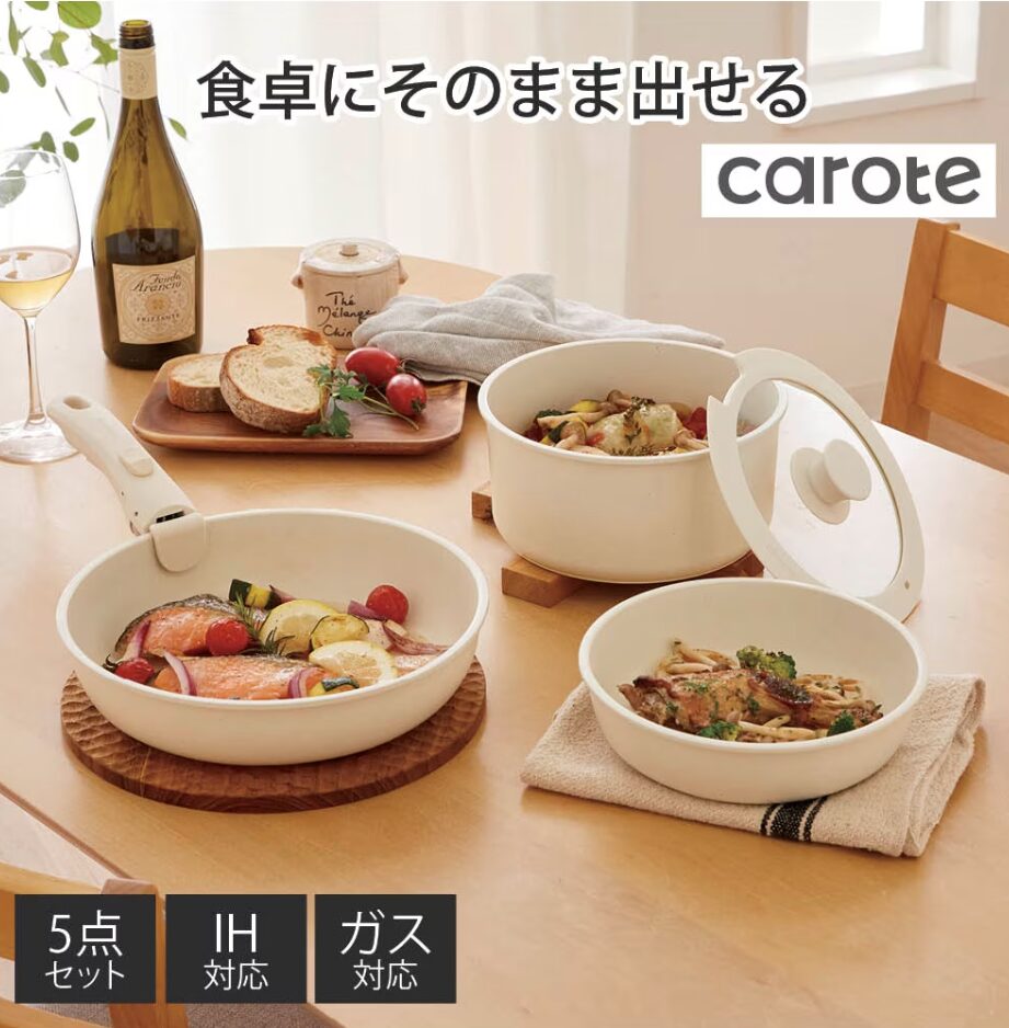 毎日の料理がもっと楽しく、おしゃれに変わる——そんなフライパンを探している方におすすめなのが、「カローテ 取っ手の取れるフライパンセット(ICE creamIH ワンハンドル 5点セット)」です。